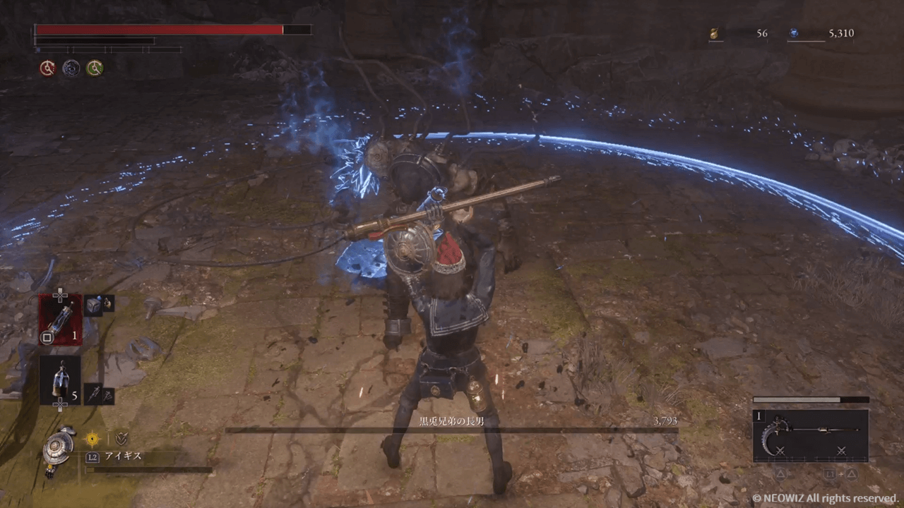 とうとう兄弟総出の複数戦だ。とはいえアクティブな相手は1人だし、相手が人間なので肉質が柔らかいのと怯んでくれるので意外と戦える。被ダメも妙に少ない。ただ非アクティブの2人が投擲でちょっかいをかけてくるのがウザったい。