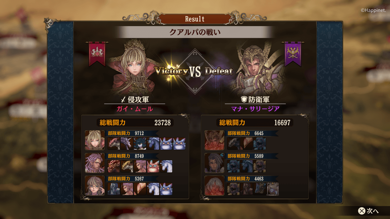 意味も無く3方向から侵攻する。出陣した合計24部隊の中から、プレイ開始時に邁進していた初期メンバーであるエルザ&ムウア&ダリアンで侵攻する。戦力差は数字上では約7900。相変わらず君主ルドとその側近カイルが怖いが全総力を以って戦う。