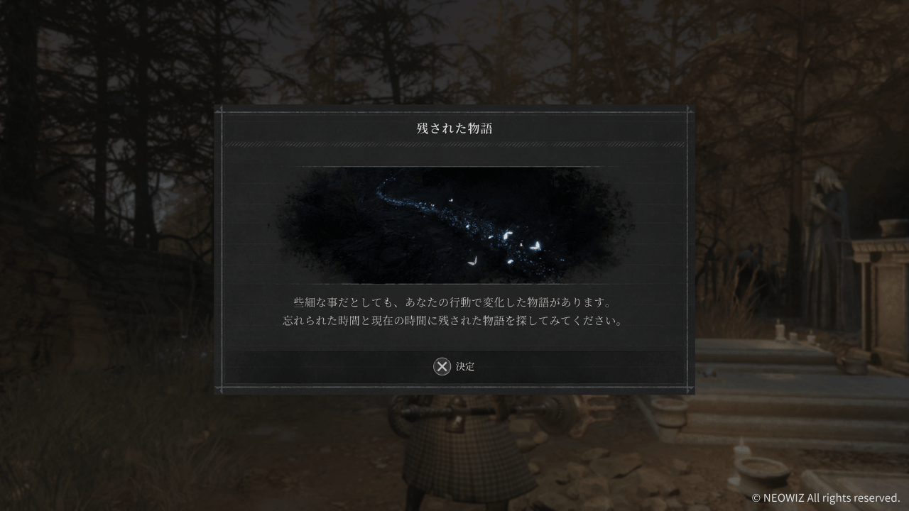 | 黒い秘密のトラッカー 血の芸術家 The Rose’s Memory 真の戦闘装備コレクター 繋がる意思 思い出の旋律(1.6%) 人間について学ぶ |